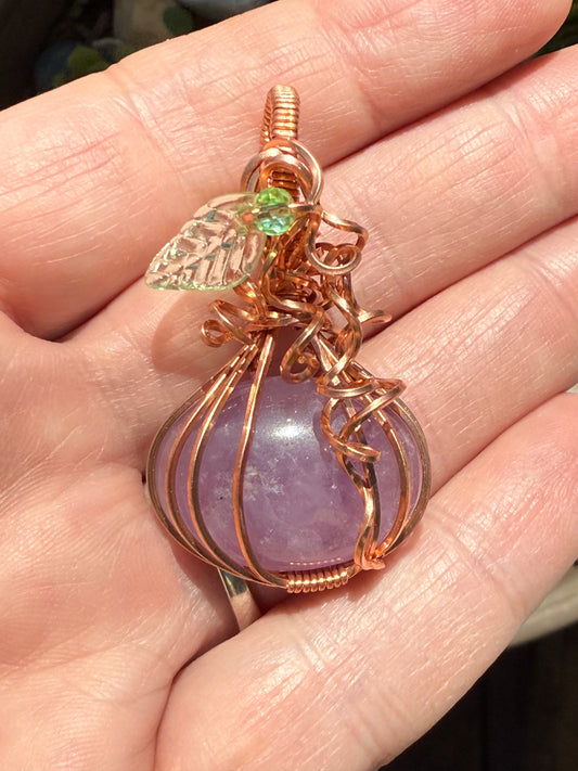 Amethyst Pumpkin with Leaf Wire Wrapped in Copper Pendant Necklace