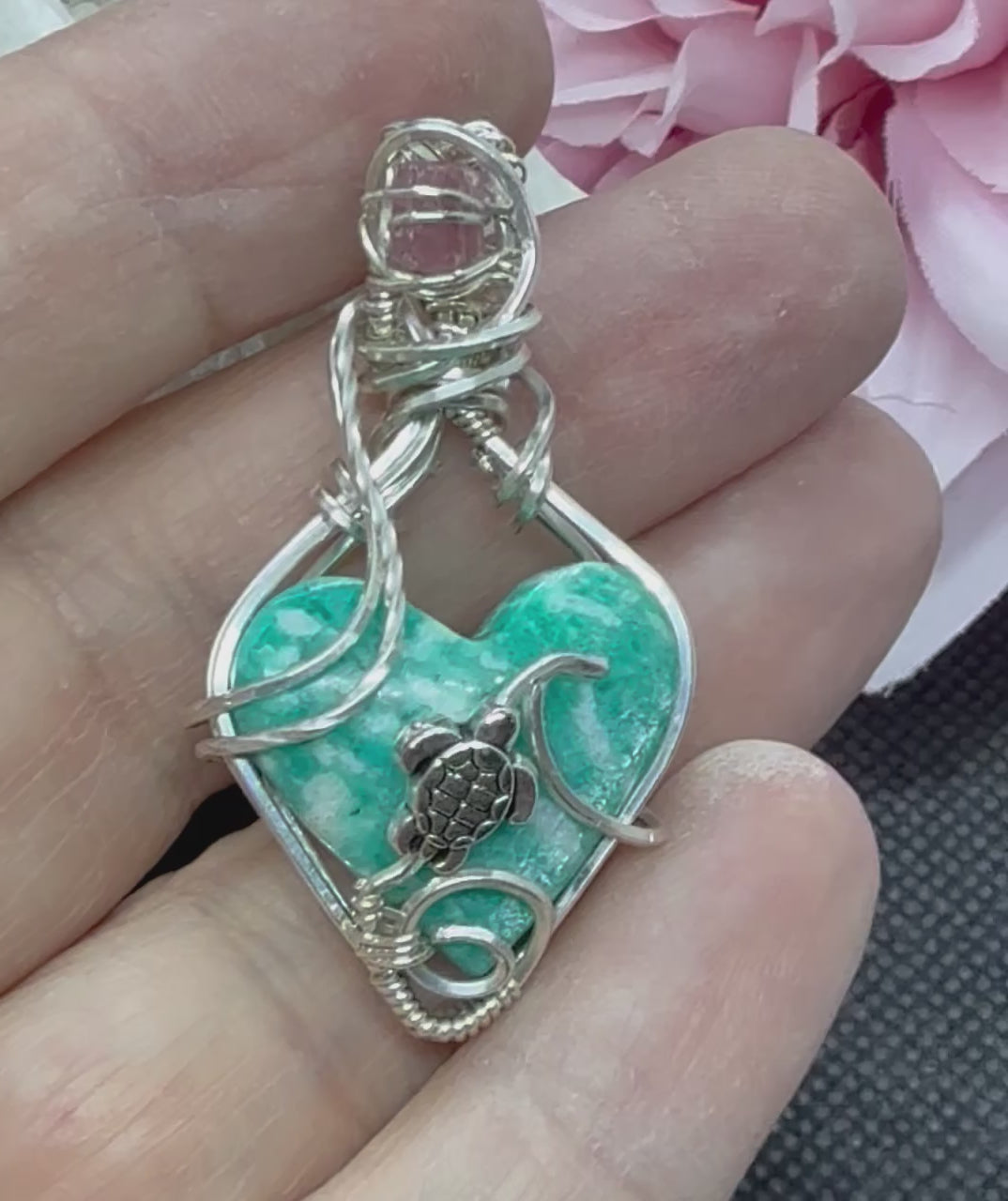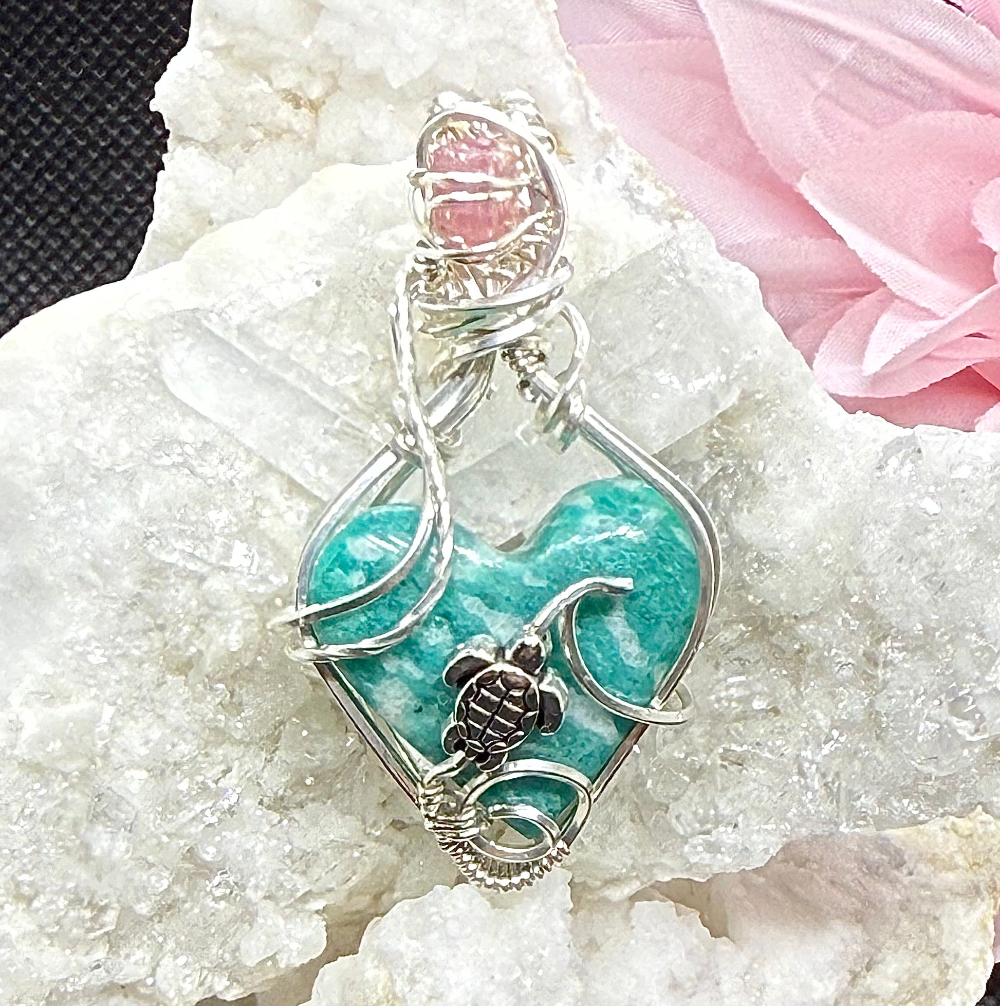 Amazonite Heart w Wave, Turtle, and Pink Tourmaline Accent in Sterling Silver Necklace Jewelry Pendant Gift Ocean Sea Blue