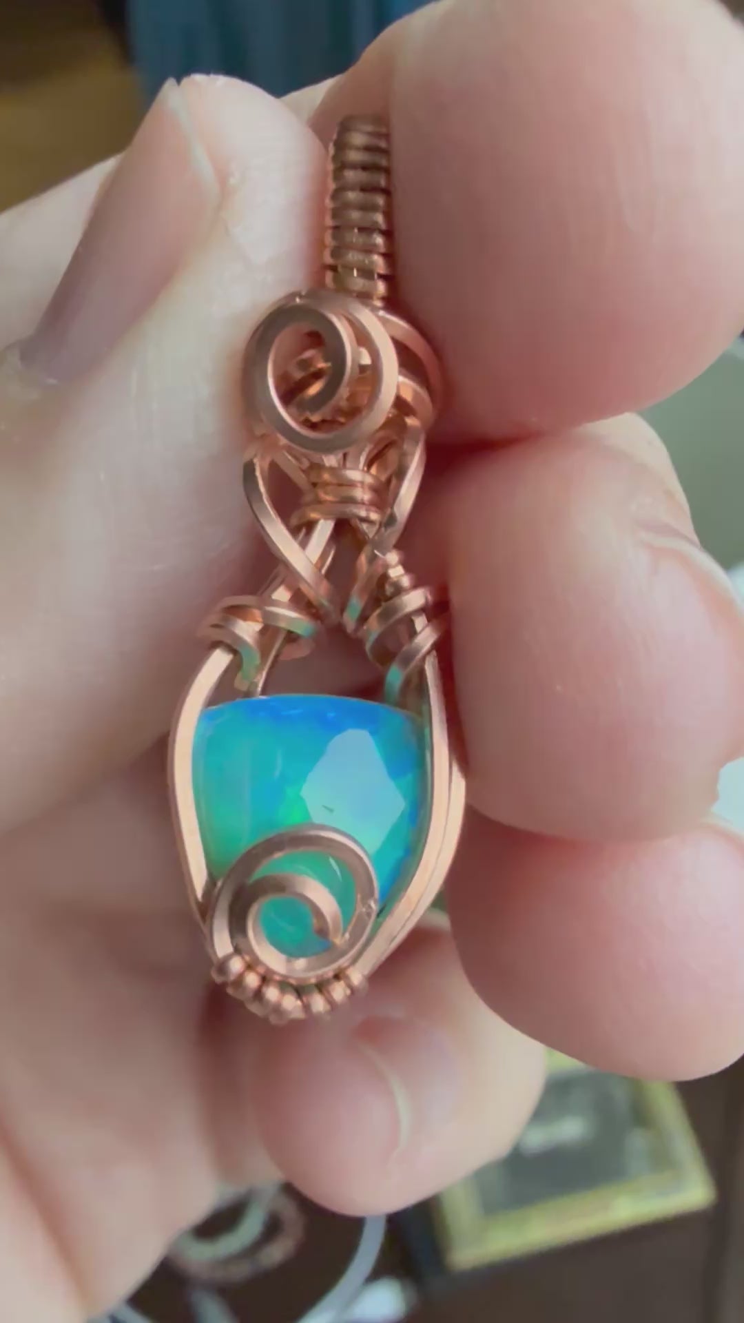 This mini pendant has maximum opal flash! Blues and greens dance as the light reflects off of the piece. Wire wrapped in copper and ready to become a staple in your jewelry collection.