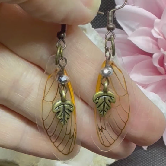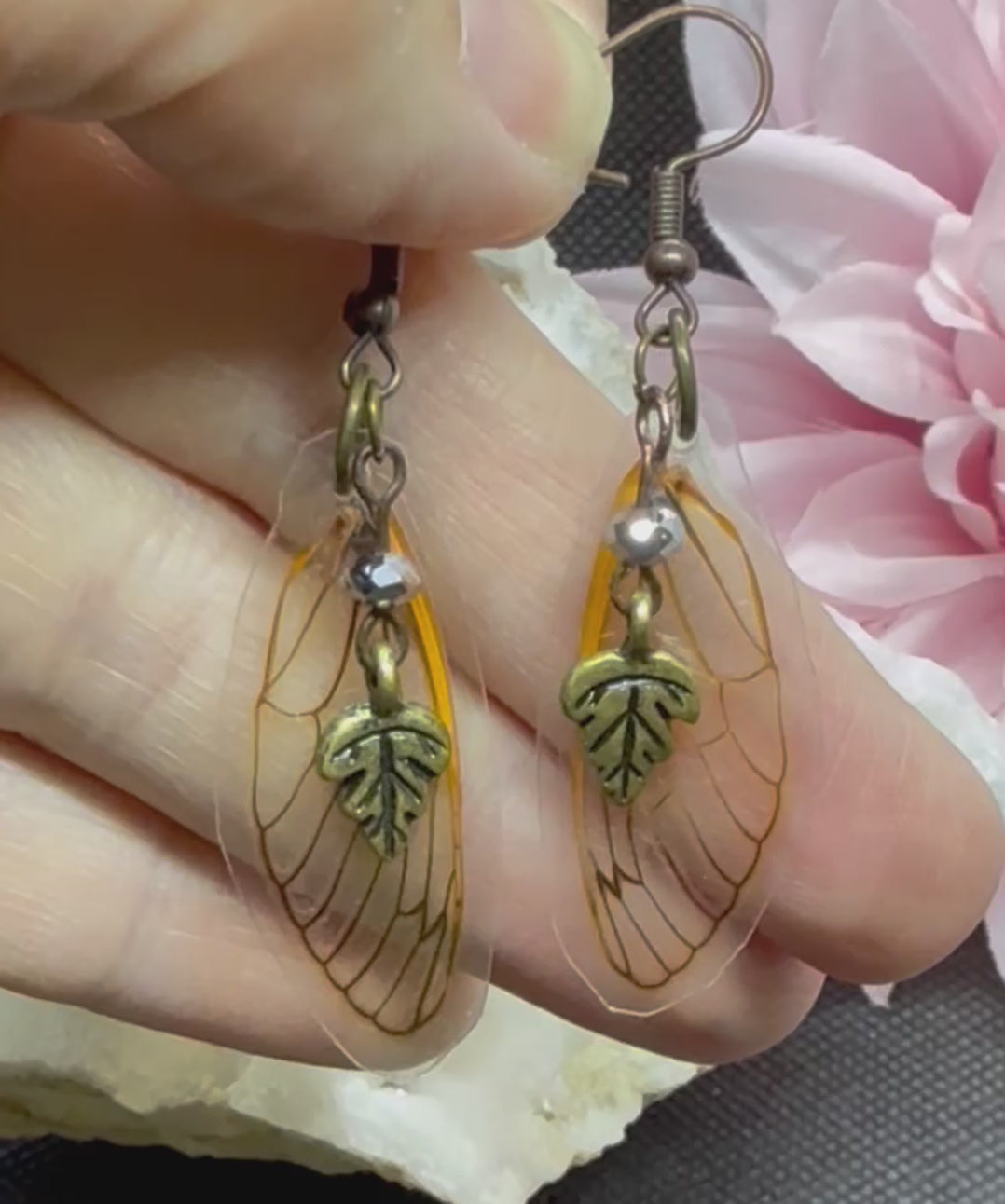 Fairy Wing Cicada Earrings w Bronze Leaf & Bead Jewelry Gift Limited