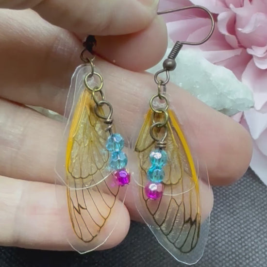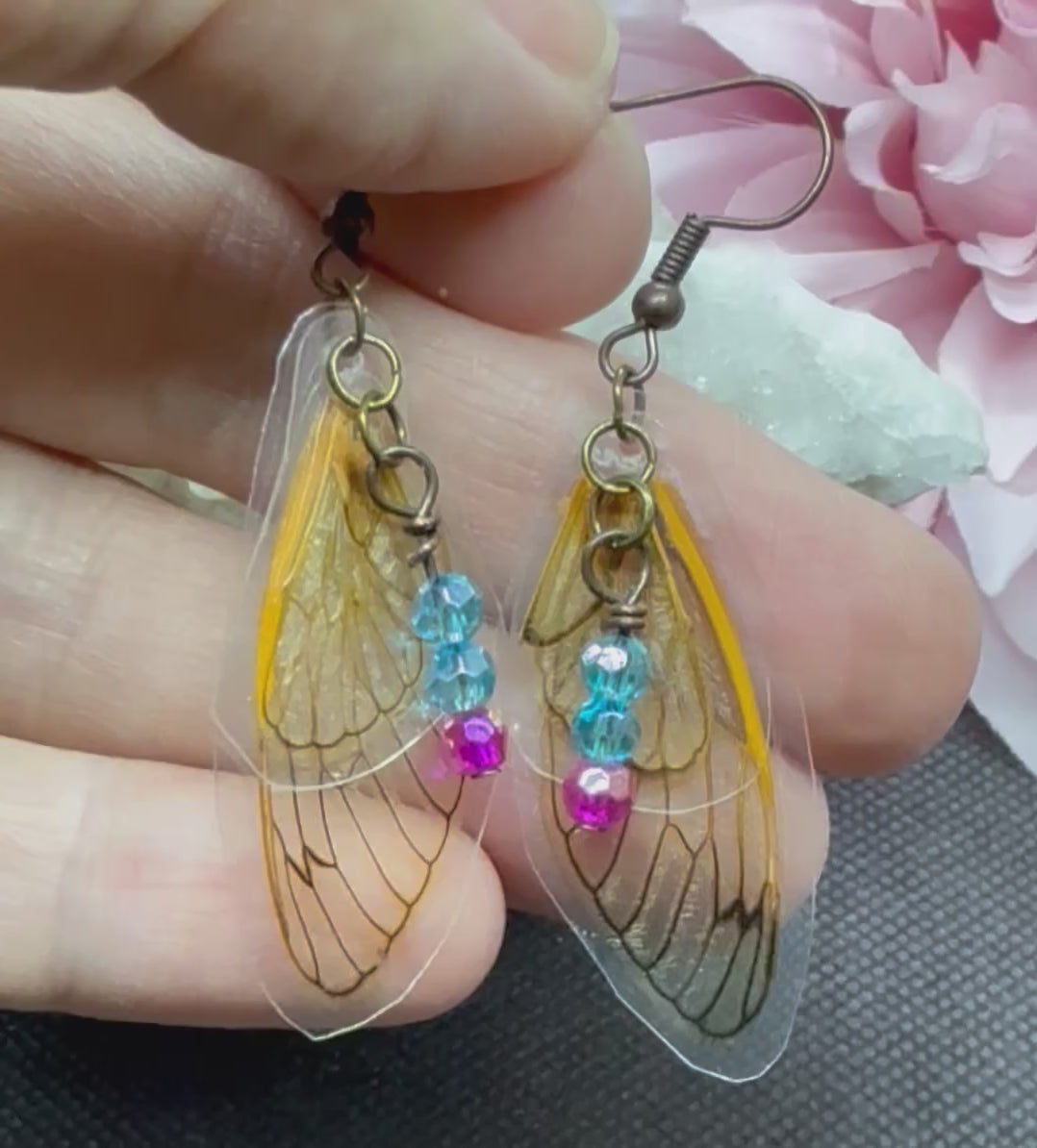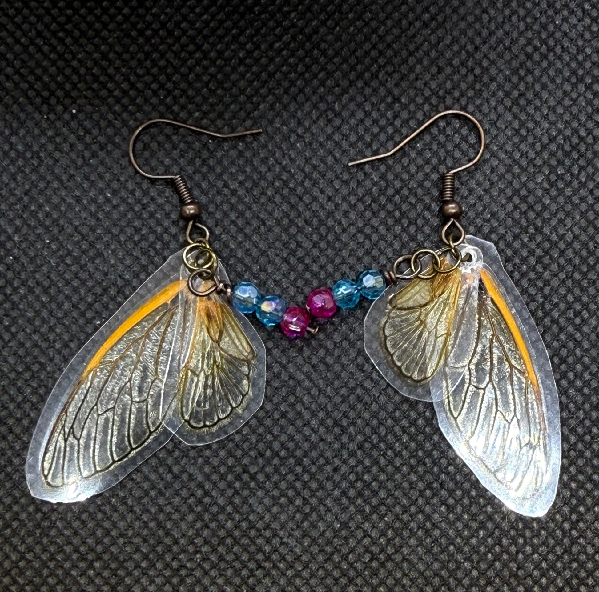 Fairy Wing Cicada Earrings w Pink & Blue Beads Jewelry Gift Limited