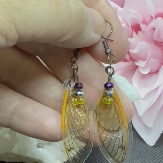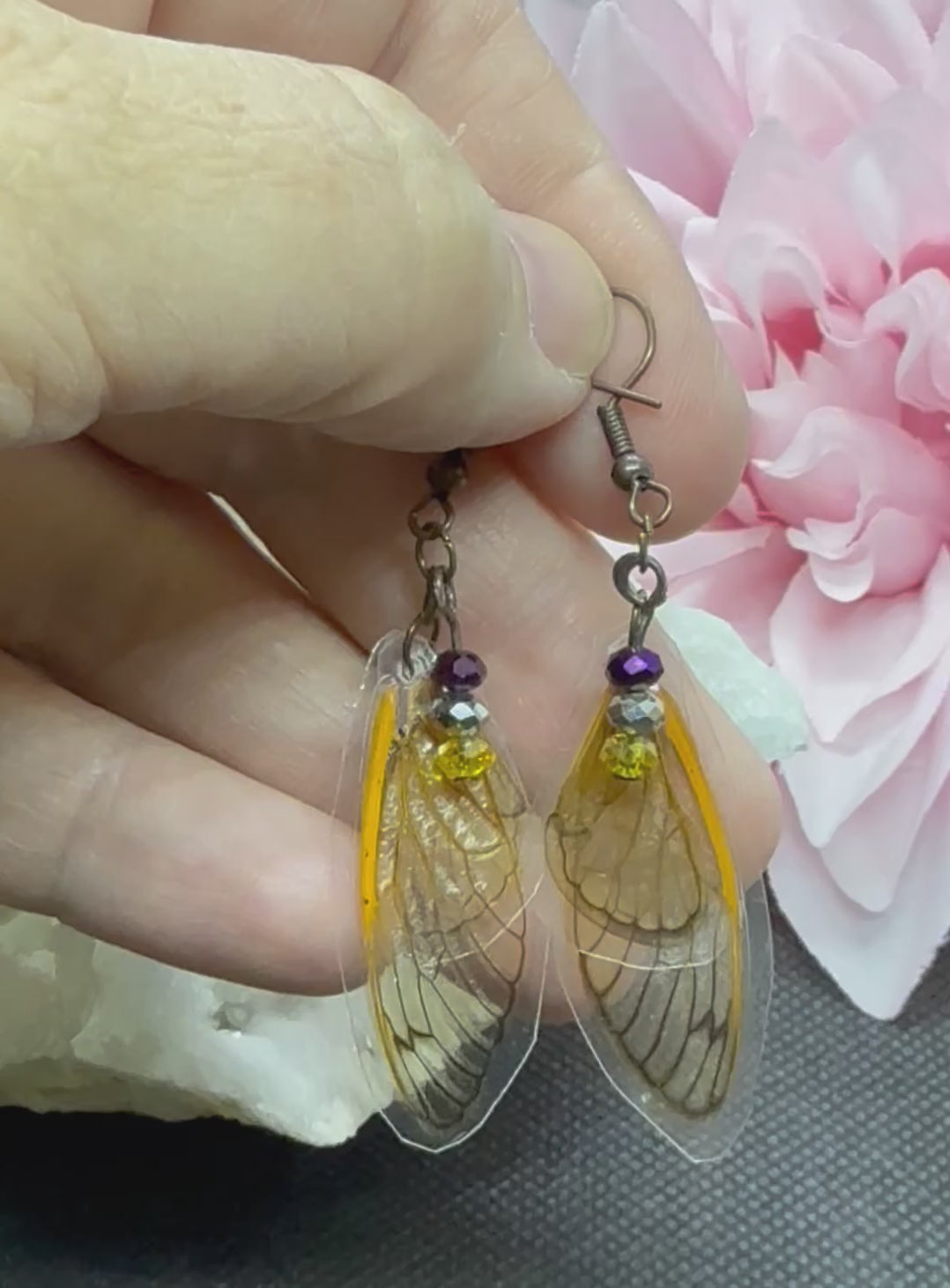 Fairy Wing Cicada Earrings w Yellow Purple Silver Beads Jewelry Gift Limited