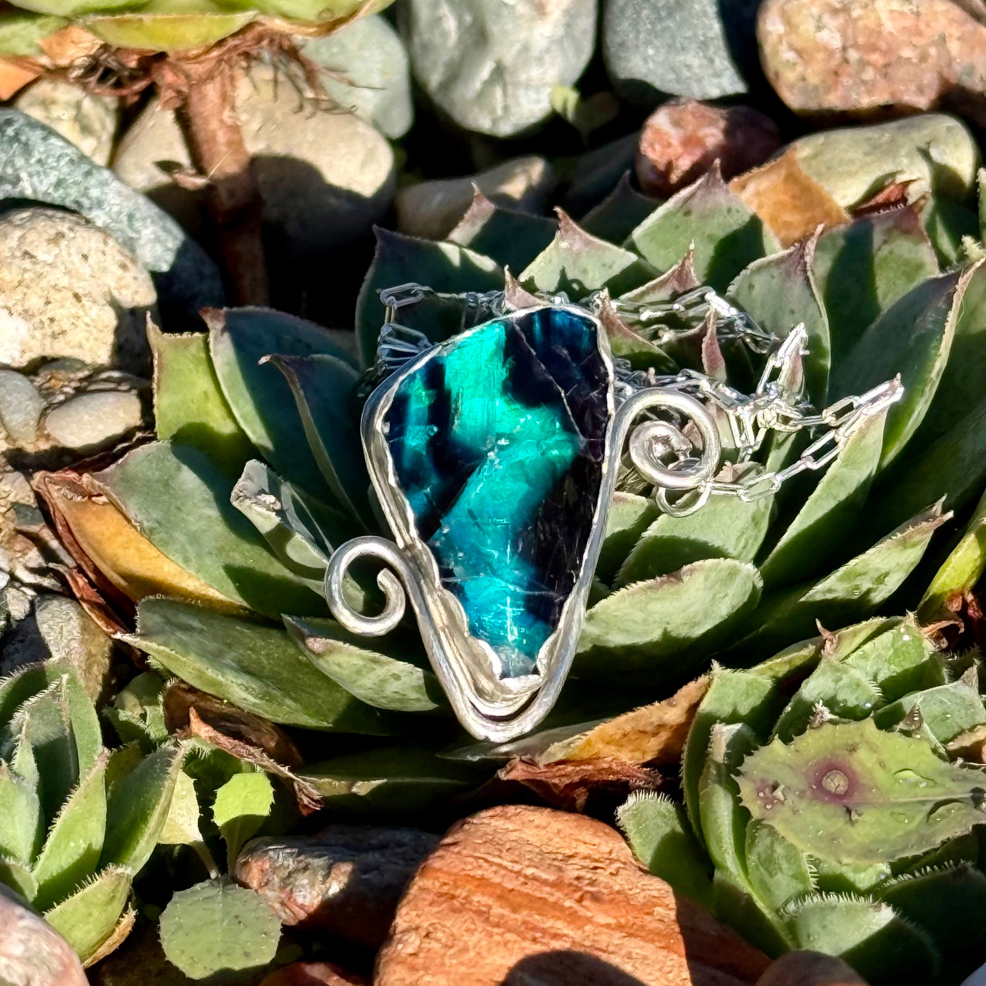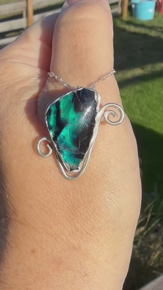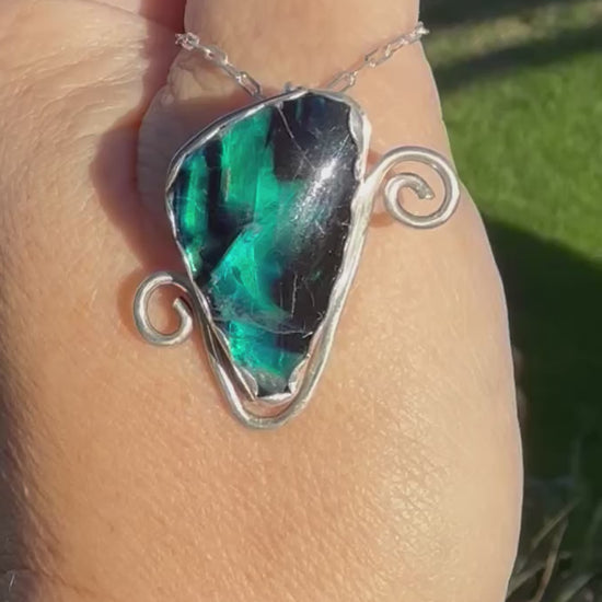 Prepare to be dazzled by this beautifully reflective pendant! The stone is feather fluorite with an aura doublet backing and is set in sterling silver. Comes with a 22” sterling silver paperclip chain.
