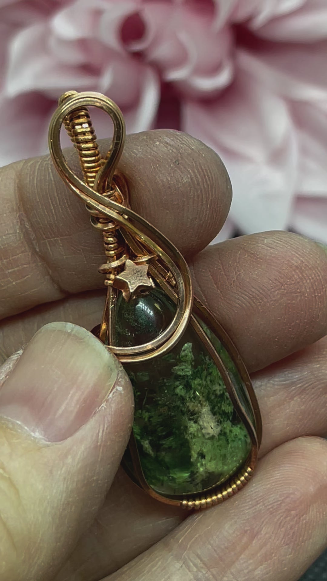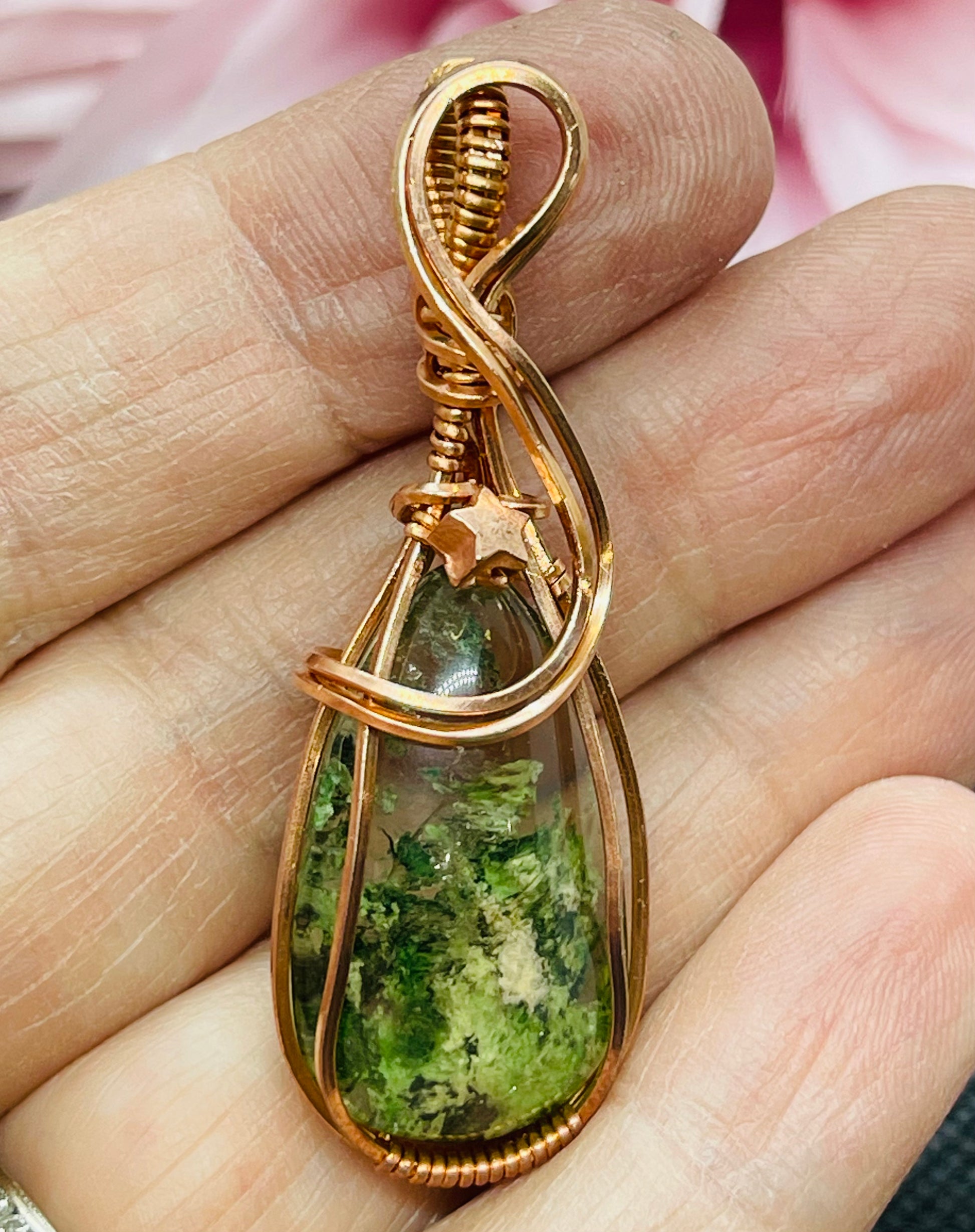 Look inside the world of this stunning garden quartz to see a beautiful scene created by nature. Wire wrapped in copper and adorned with a copper star. This pendant stands 2.25 inches tall.