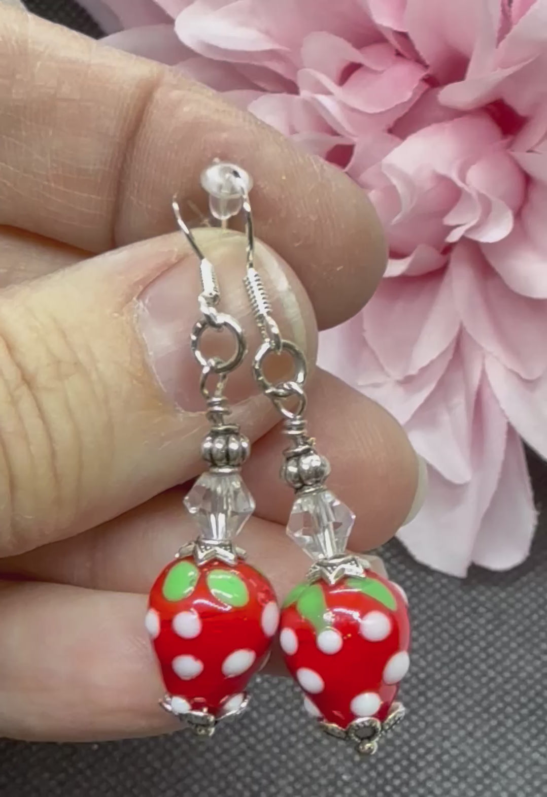 Perfect for spring! These glass strawberry earrings have a 2 inch drop and feature silver tone accents and clear crystals. Show your whimsical side by wearing these wonderful earrings.