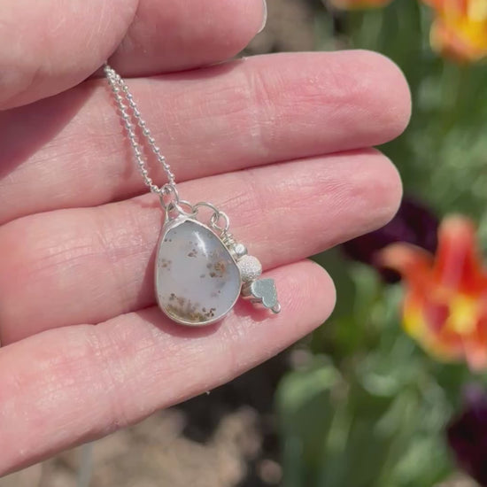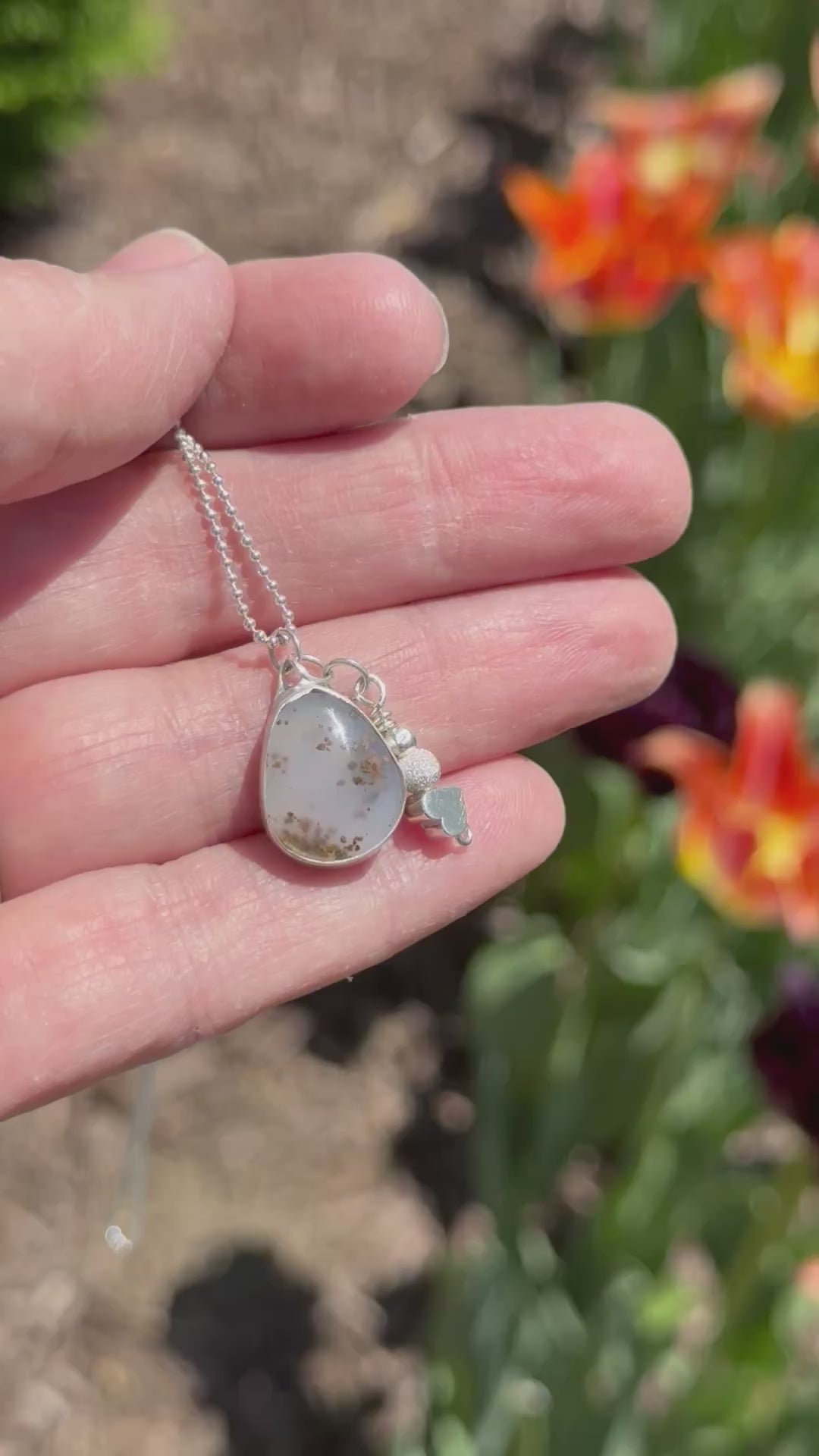 This teardrop chalcedony with dendrites has been lovingly cast in a sterling silver setting. Accenting the piece are sterling silver beads and a small sterling silver heart. Hand filed and polished, this one inch custom necklace will have you collecting compliments every time you wear it. 18 inch sterling silver chain included.