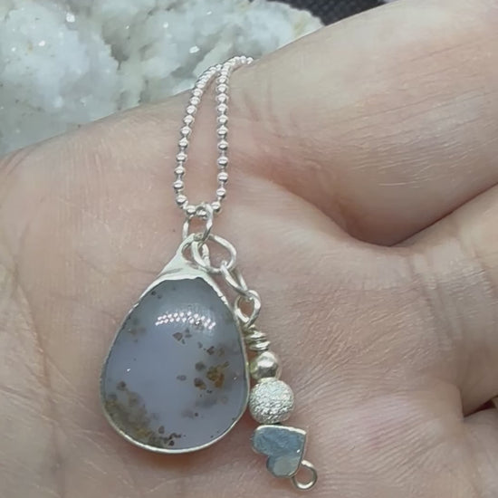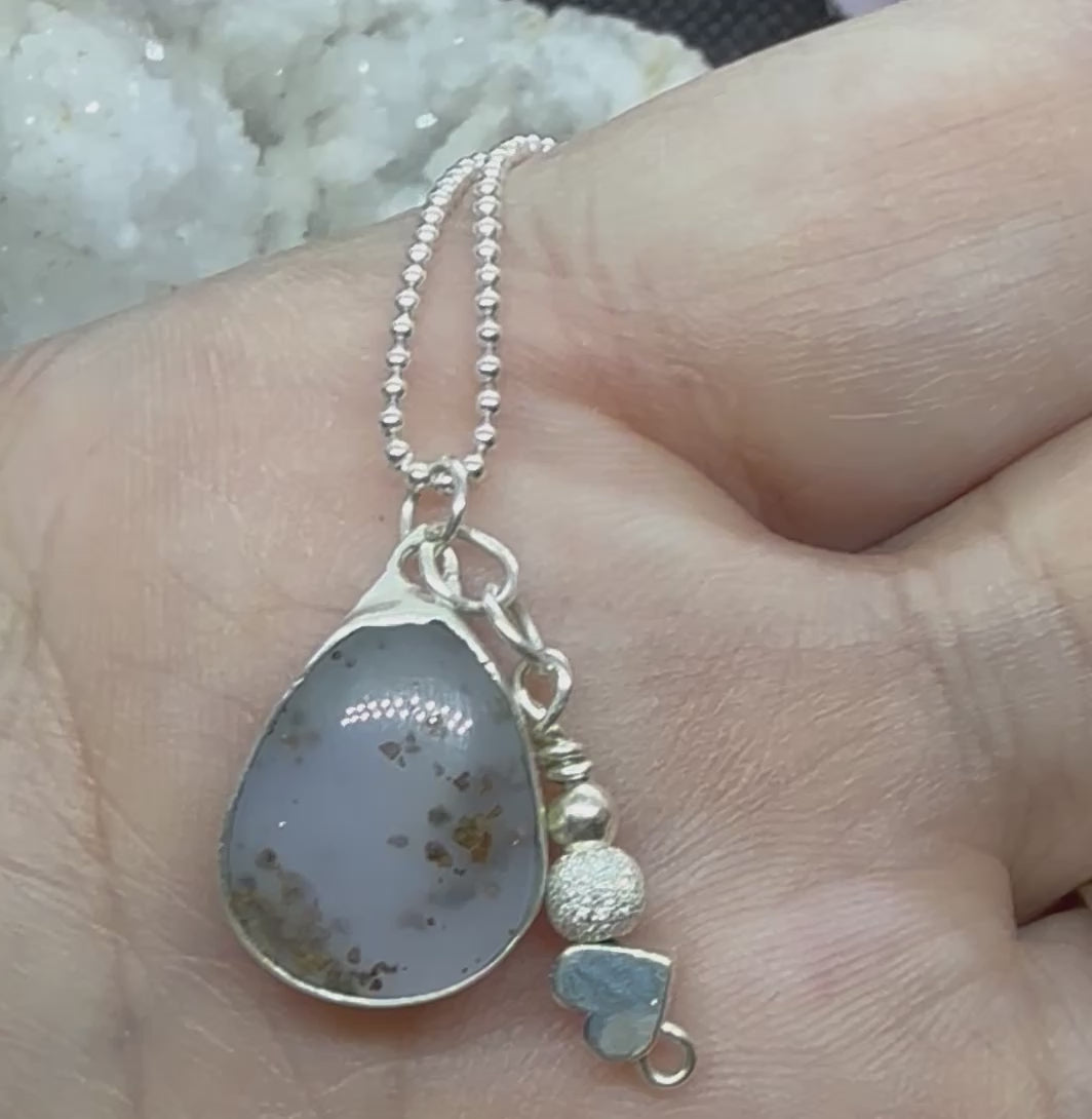 Hand Soldered Sterling Silver Setting with Chalcedony Crystal with Dendrites & Silver Heart and Bead Accents Necklace Jewelry Pendant CHAIN INCLUDED