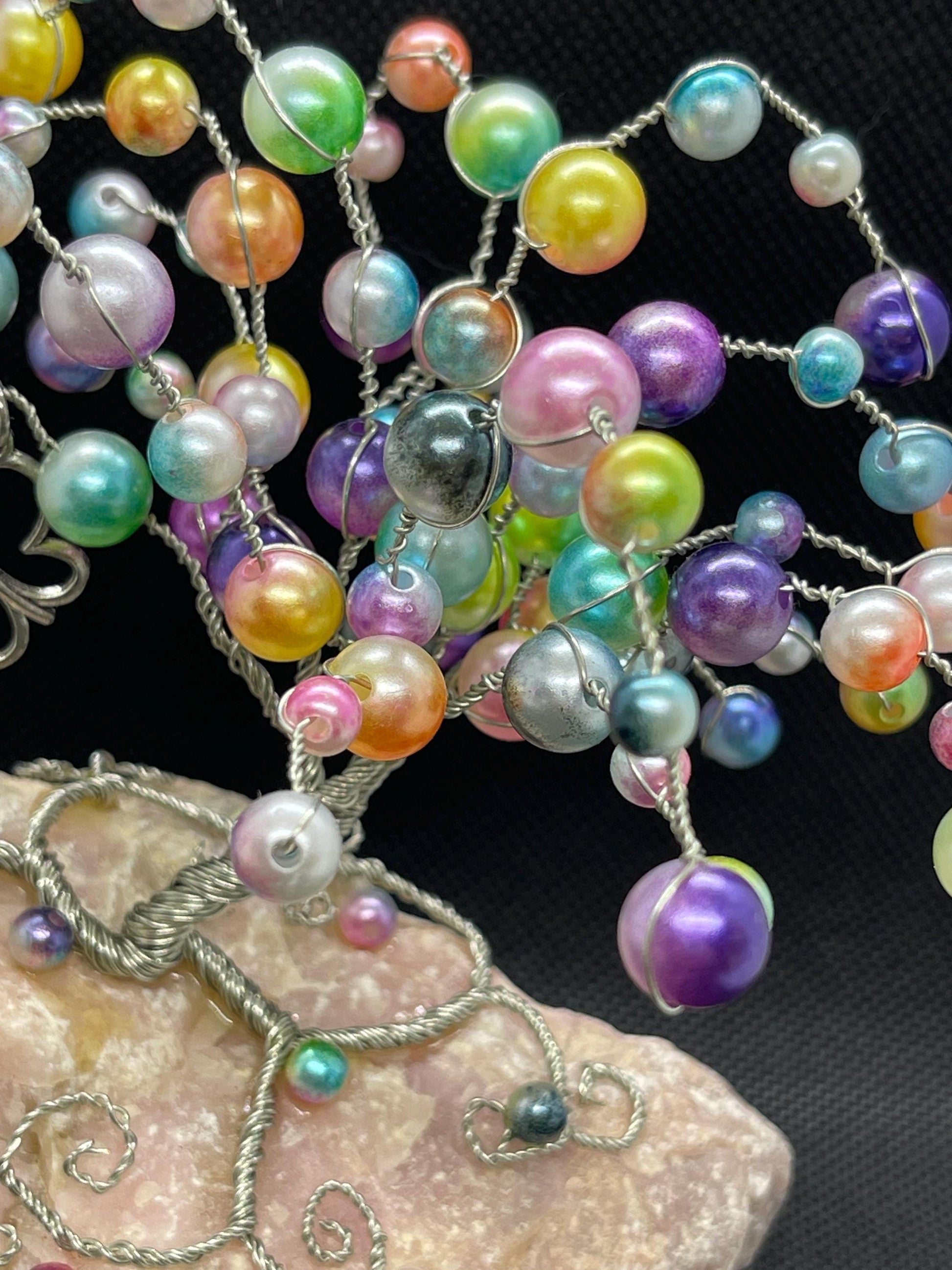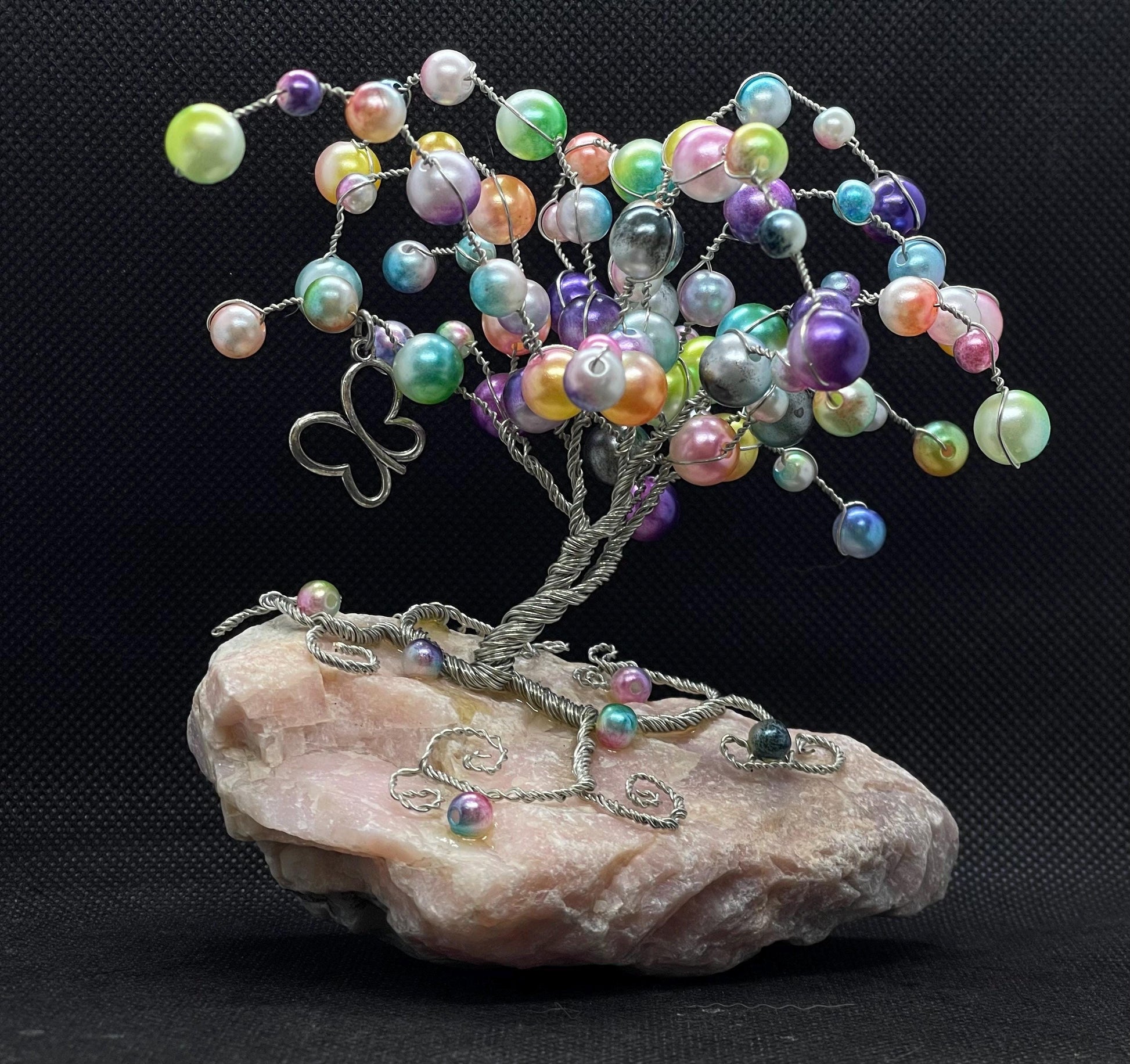 Whimsical wire tree made with bubble beads on top of rose quartz crystal with a silver butterfly.