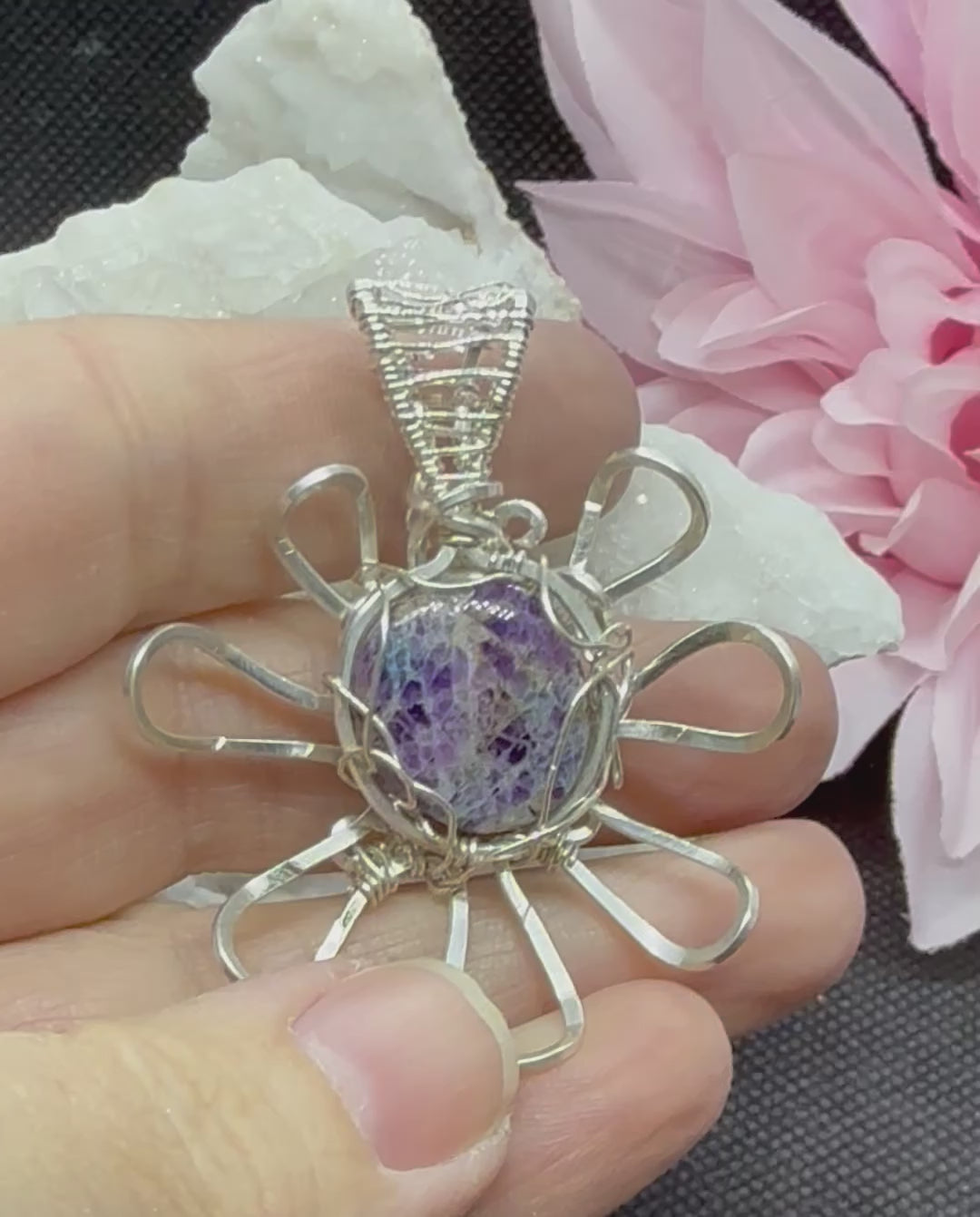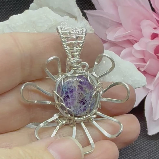 This mesmerizing purple kaleidoscope agate will stun you! As the center of this playful flower design it is one of a kind and will keep you busy gathering compliments.
