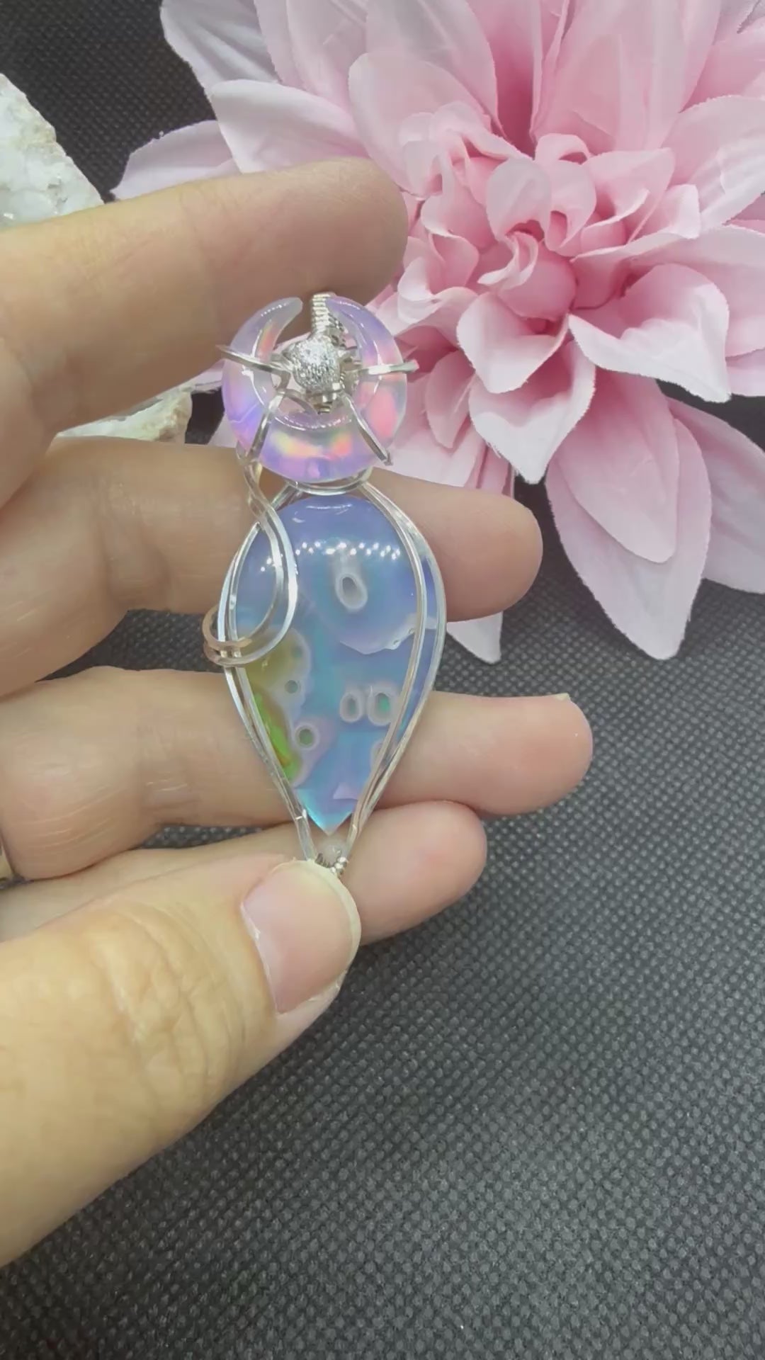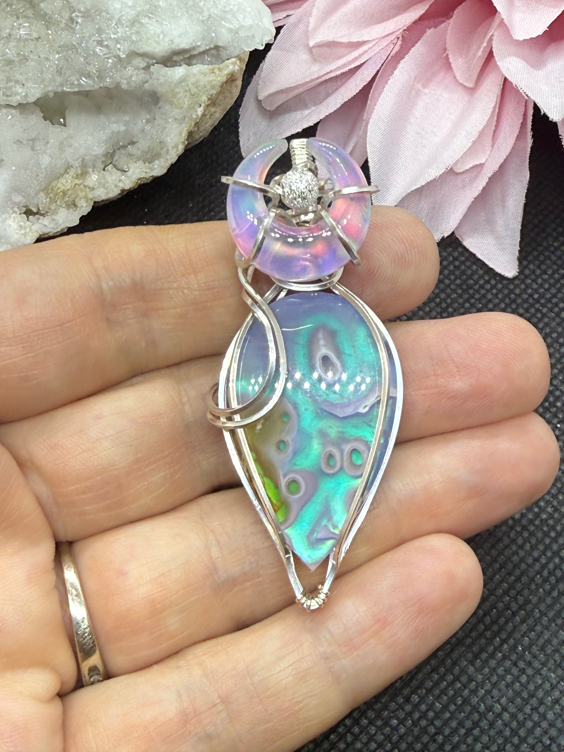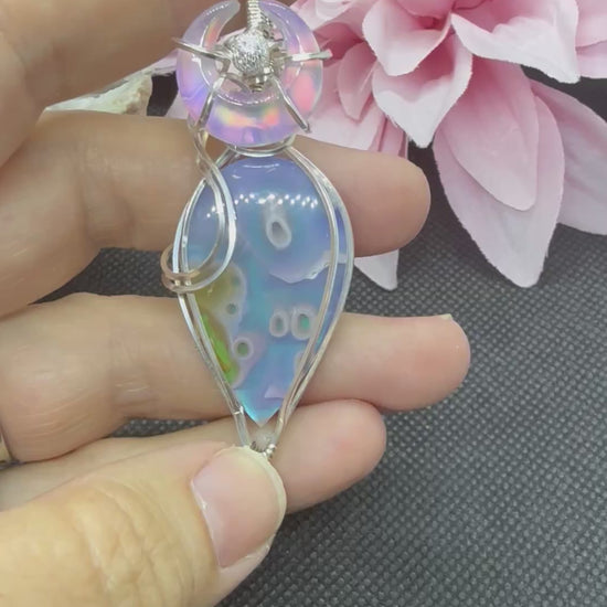 This fabulous statement piece consists of a moss agate doublet and aurora opal crescent moon wrapped in sterling silver. At 2.5 inches high and accented with a sterling silver bead, the shimmer of rainbow colors will blow your mind. You will not regret having this beautiful piece in your jewelry collection.