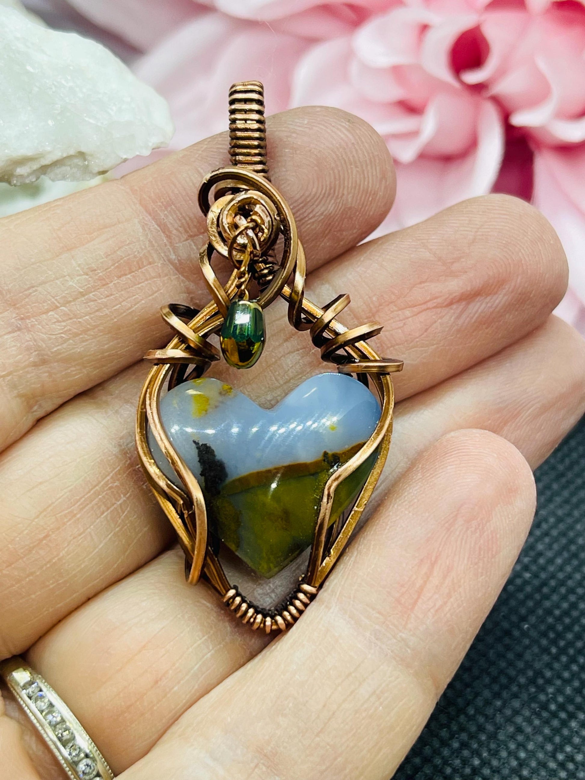 Polka Dot Agate Heart Pendant Wire Wrapped in Antiqued Copper with Green/Gold Bead Accent Jewelry Necklace Gift