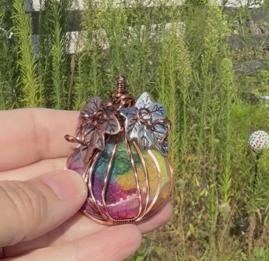 Bask in the stunning beauty of this druzy rainbow pumpkin! It matches every outfit and will make you smile every time you wear it.