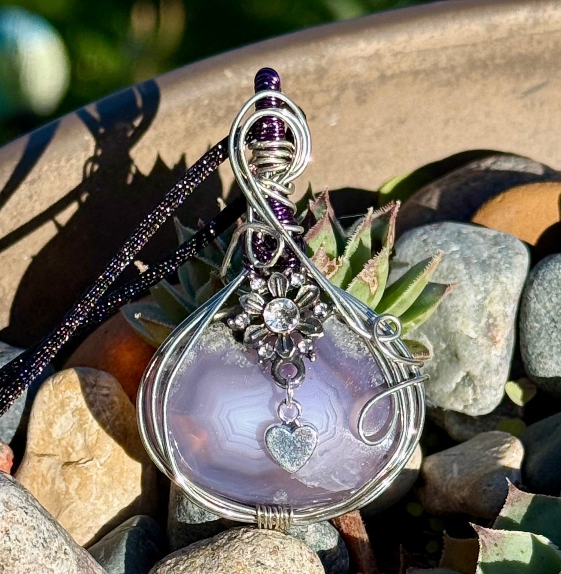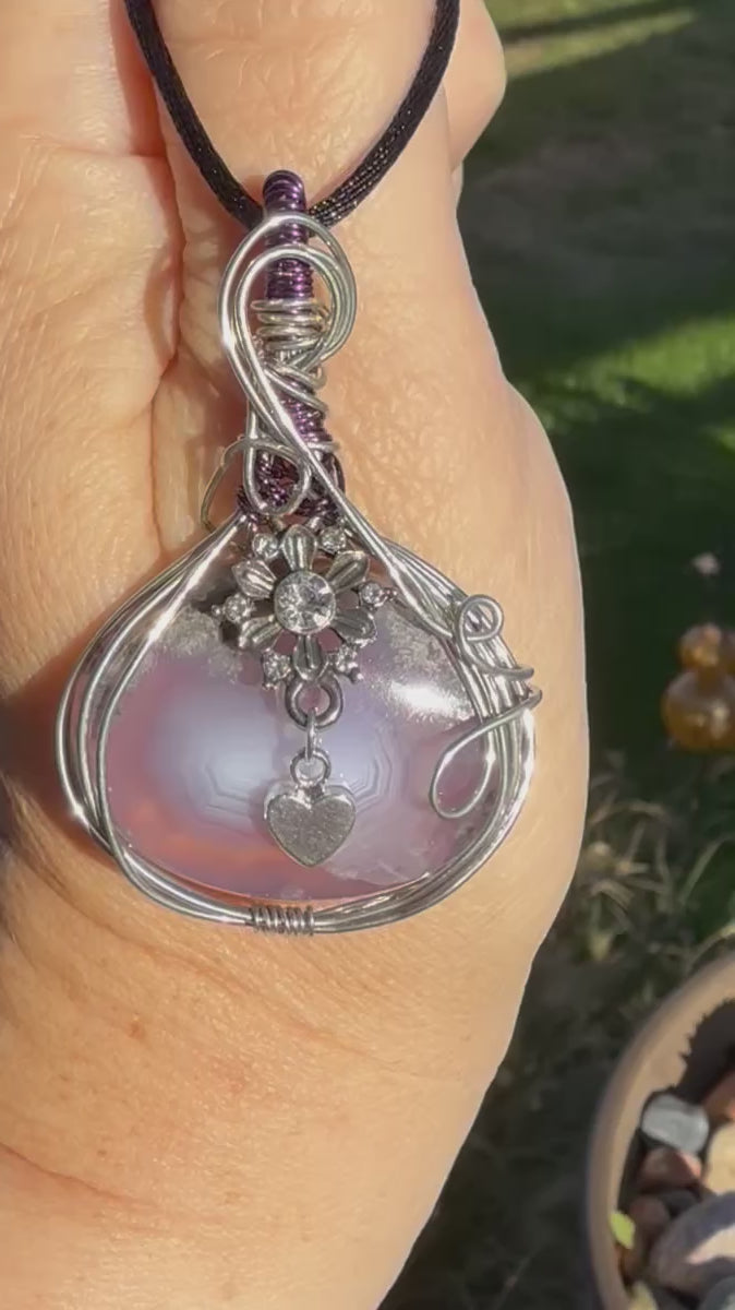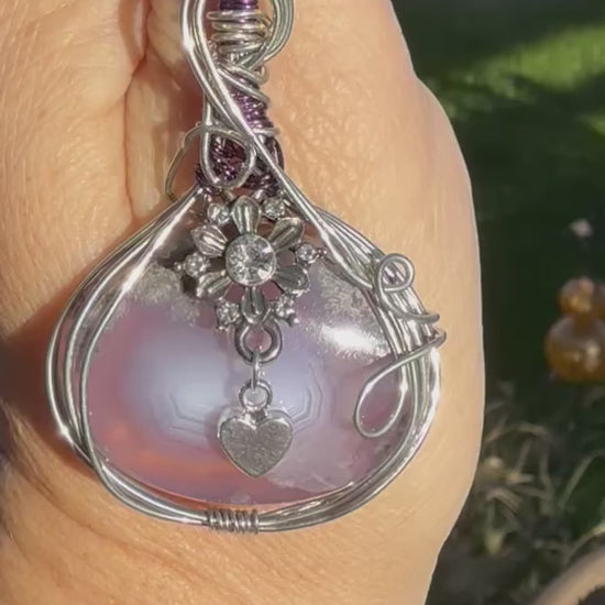 This lovely moss agate is wire wrapped in tinned copper and adorned with a brooch bead and metal heart. Romantic and dreamy, this piece will win your heart.