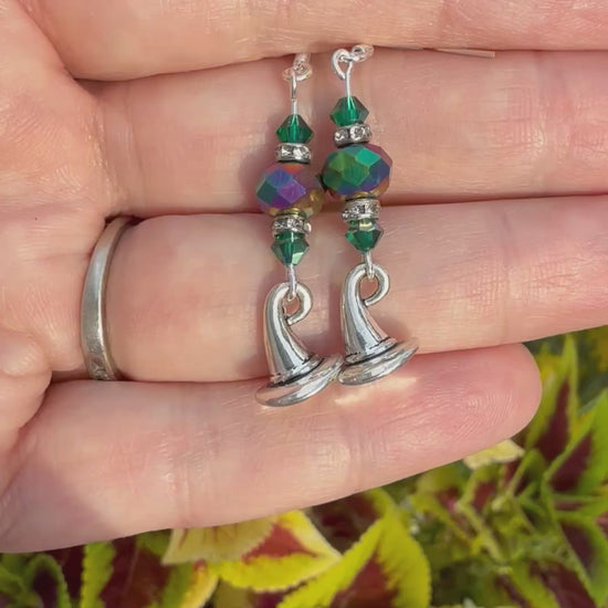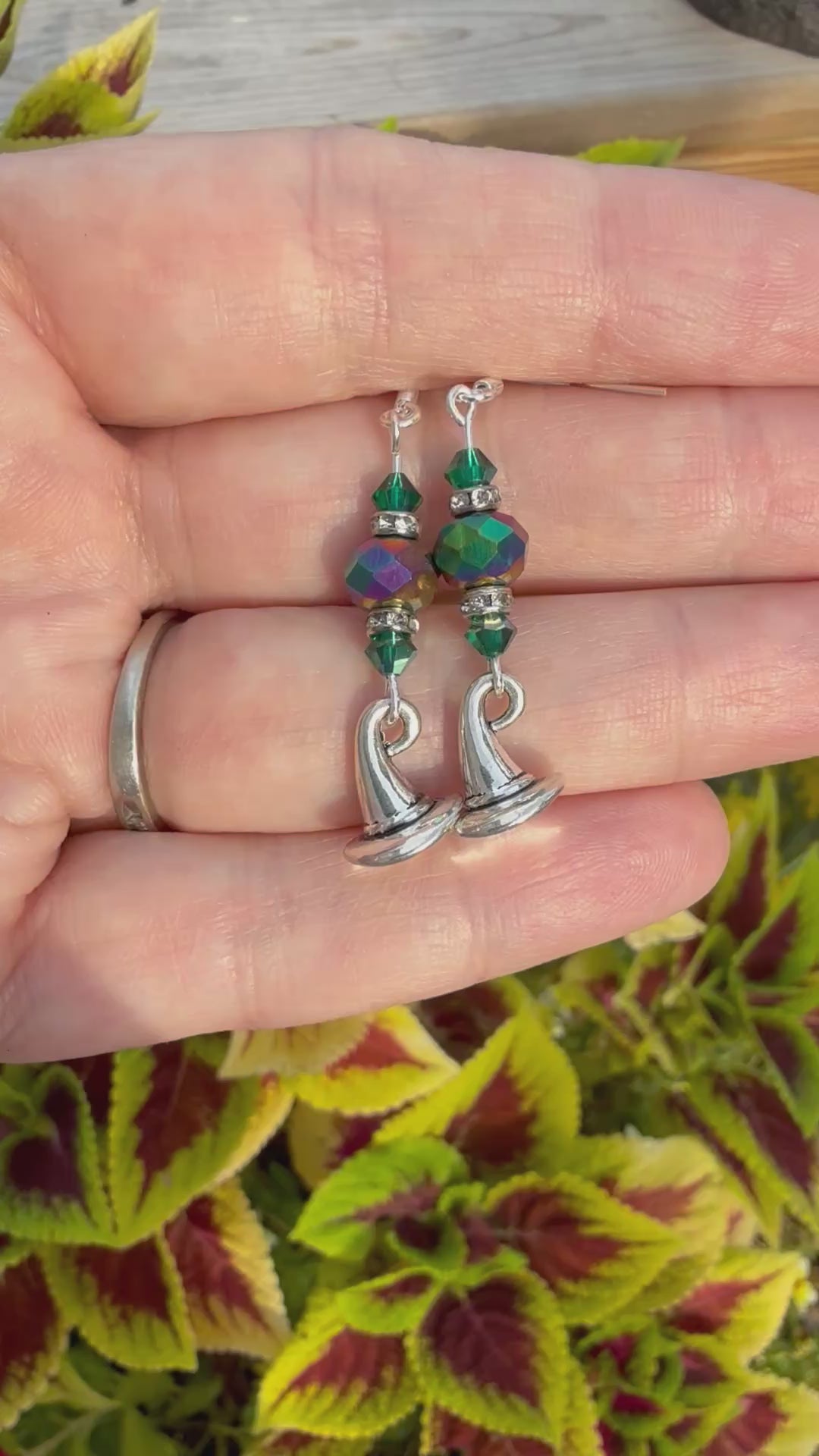 Witch Hat Earrings with Black Iridescent Beads Silver Hooks