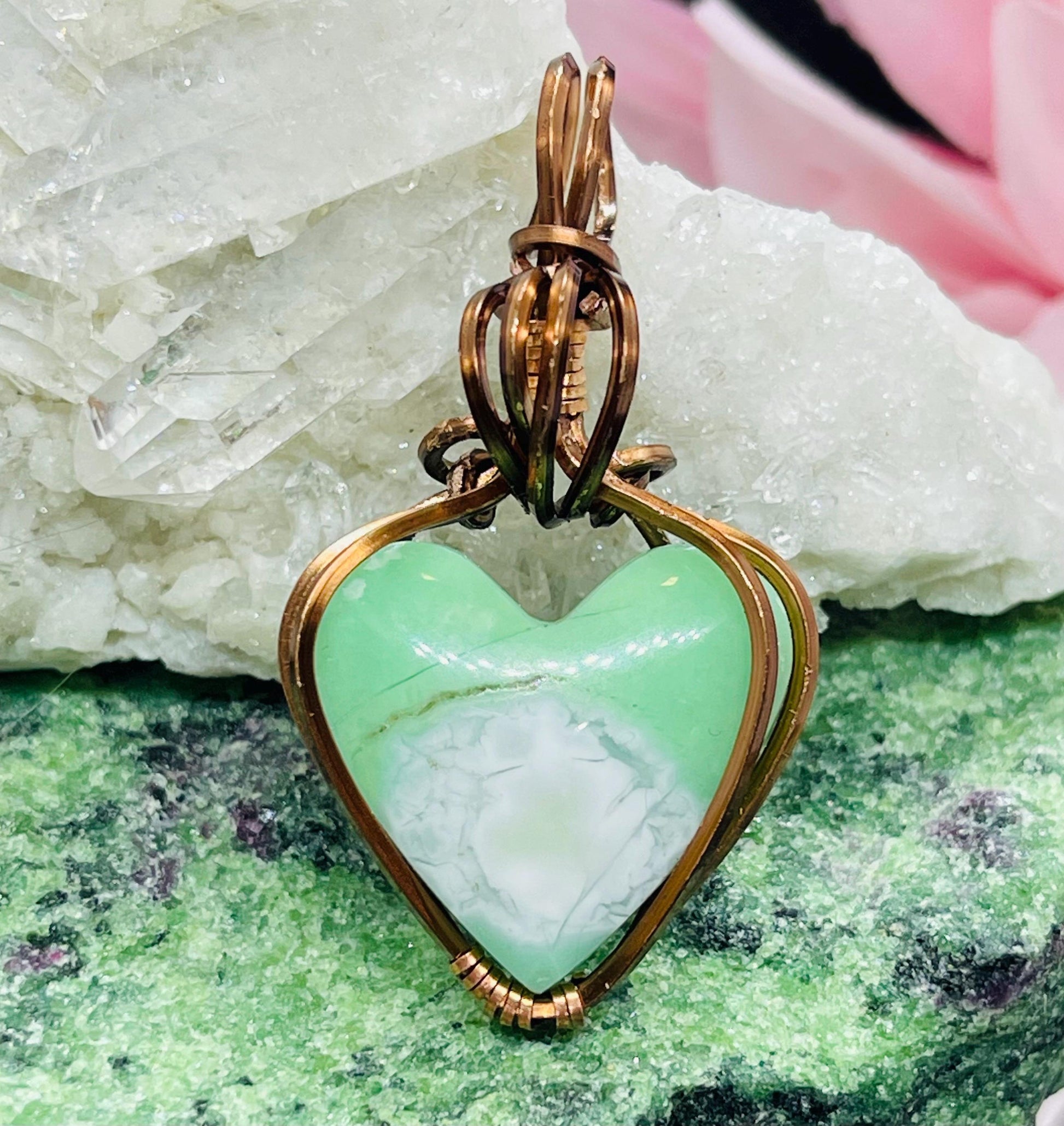 This stunning Chrysoprase heart is wrapped in copper wire. Perfect for yourself or someone you love.
